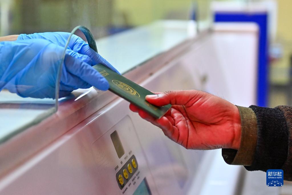 在新疆紅其拉甫口岸聯檢大廳,出境旅客在辦理邊檢手續(11月6日攝)。