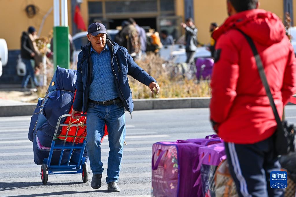 出境旅客攜帶行李前往新疆紅其拉甫口岸聯檢大廳(11月6日攝)。