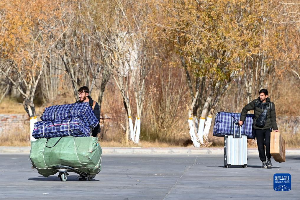 出境旅客攜帶行李前往新疆紅其拉甫口岸聯檢大廳(11月6日攝)。
