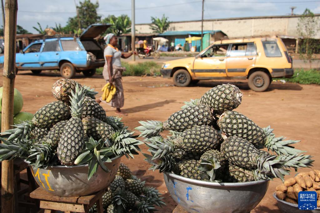 這是10月23日在貝寧“甜麵包”菠蘿主産區澤鎮拍攝的水果攤上的菠蘿。