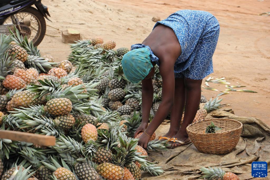 10月23日,一名女孩在貝寧“甜麵包”菠蘿主産區阿拉達的一處收購點擺放菠蘿。