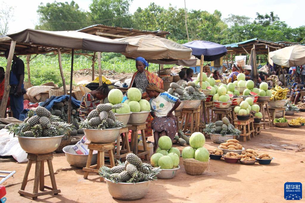 這是10月23日在貝寧“甜麵包”菠蘿主産區澤鎮拍攝的水果攤上的菠蘿。