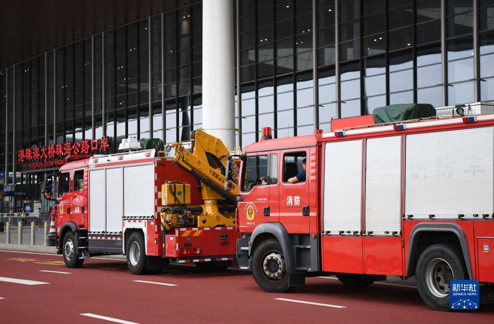 11月7日在港珠澳大橋珠海公路口岸拍攝的參加演練的消防車輛。