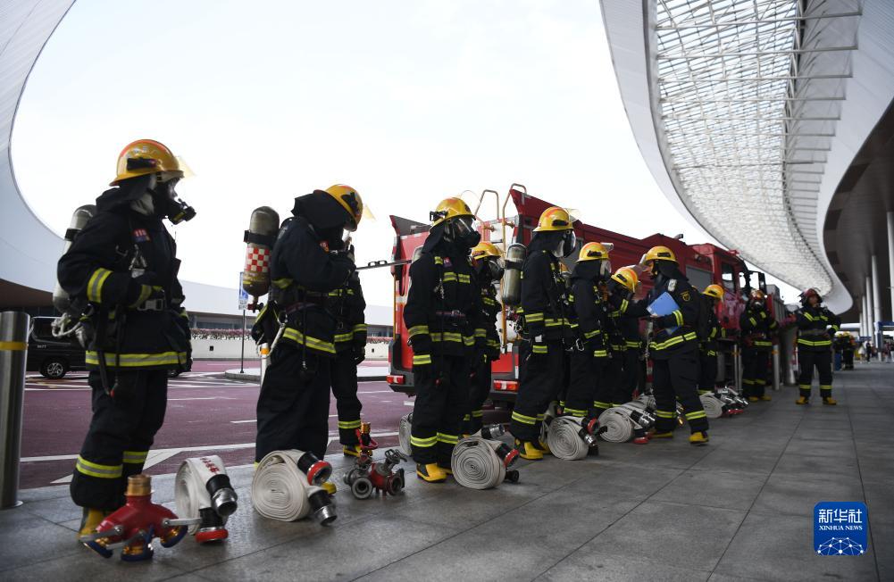 11月7日,在港珠澳大橋珠海公路口岸,參加演練的廣東消防員在整理裝備。