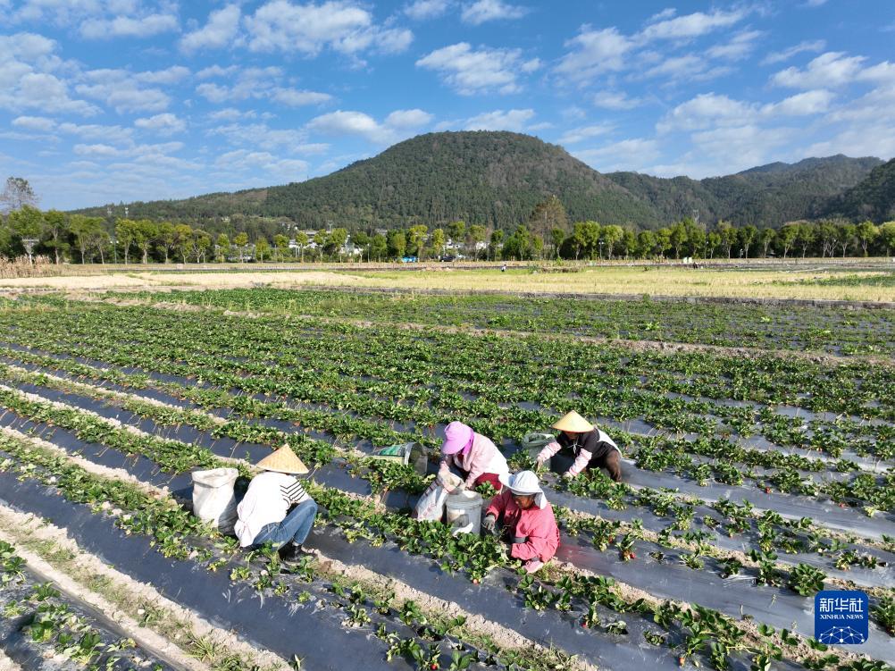 11月7日,在雲南省騰衝市和順鎮,農民在田間管護草莓苗(無人機照片)。