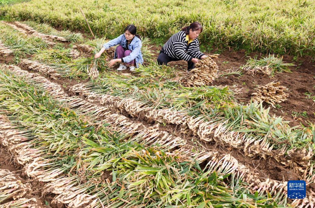 11月7日,在貴州省銅仁市玉屏侗族自治縣平溪街道馬頭田村,農民在田間收穫生薑。