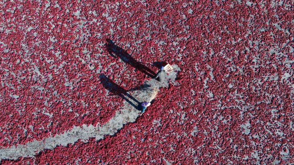11月7日,甘肅省定西市安定區鳳翔鎮李家咀村的農民在晾曬辣椒(無人機照片)。