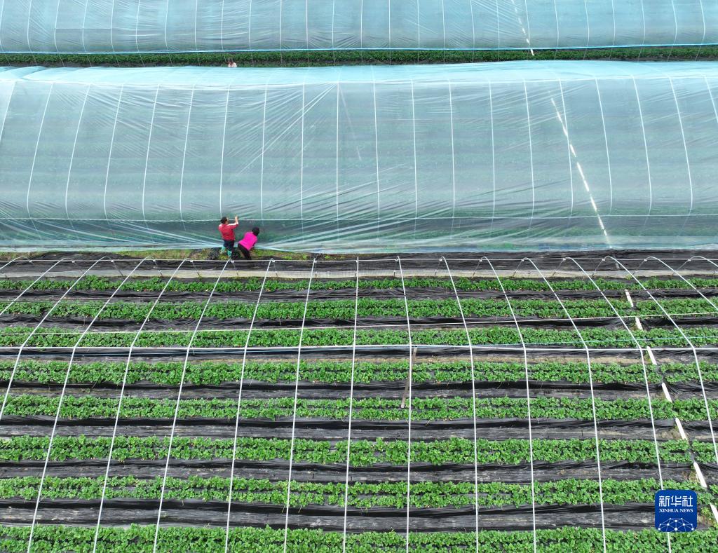 11月7日,在湖南省永州市道縣壽雁鎮永豐村,農民在覆蓋草莓大棚薄膜(無人機照片)。