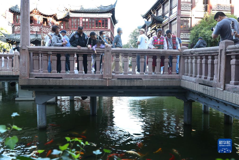 馬馬尼大叔和妻子格洛麗亞在上海豫園游玩時觀看水中的錦鯉(11月2日攝)。