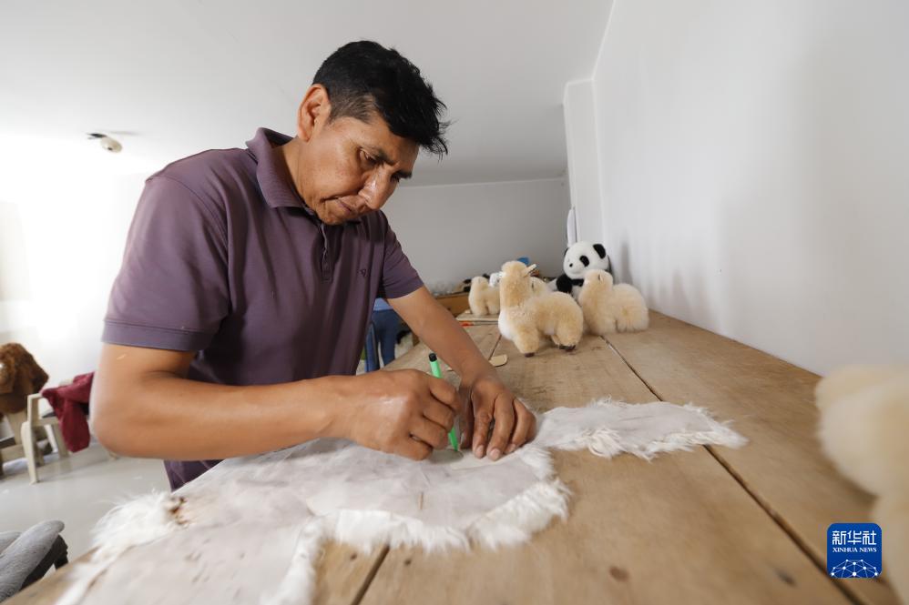 在秘魯南部城市阿雷基帕的工坊內,馬馬尼大叔製作羊駝手工藝品(10月27日攝)。