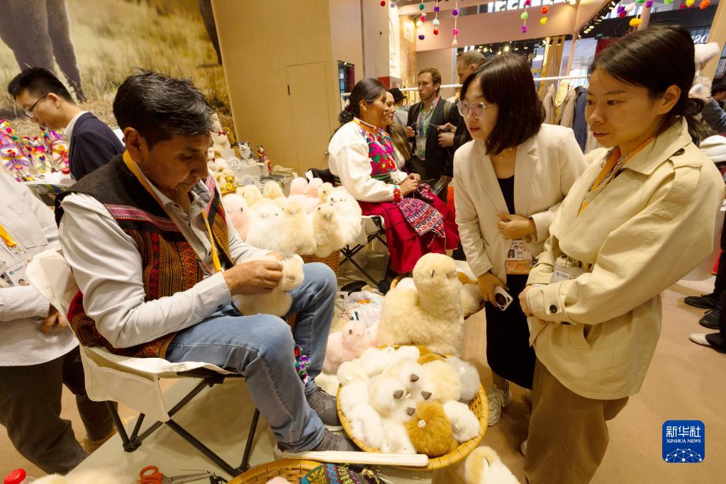 11月7日,參觀者在上海進博會“溫暖駝”品牌展&觀看馬馬尼大叔製作羊駝玩偶。