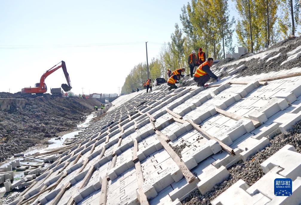 11月7日,工人在唐山市豐南區王蘭莊鎮彭家莊村灌溉水渠護坡加固工地施工。