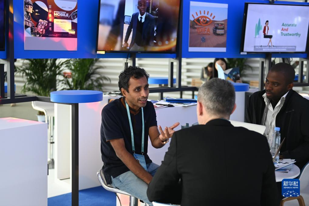 11月7日,“互聯網之光”博覽會境外展區的參展商代表在洽談區交流。