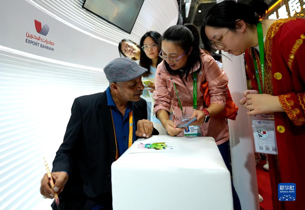 11月7日,在第六屆進博會國家展區,巴林王國展&一位藝術家與觀眾互動交流。
