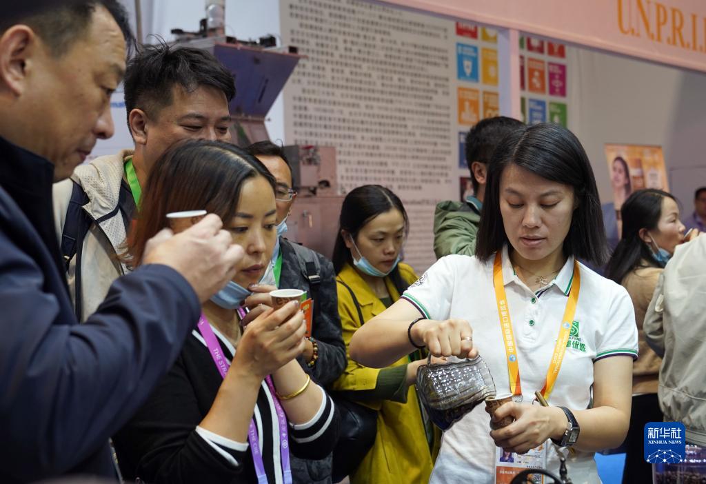 11月7日,在第六屆進博會食品及農産品展區,展商請觀眾品嘗來自印尼的咖啡。