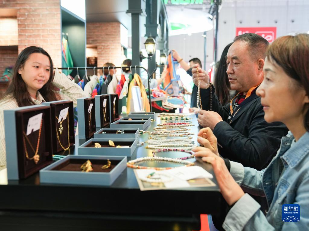11月7日,在第六屆進博會消費品展區,參觀者在挑選來自格魯吉亞的項鏈。