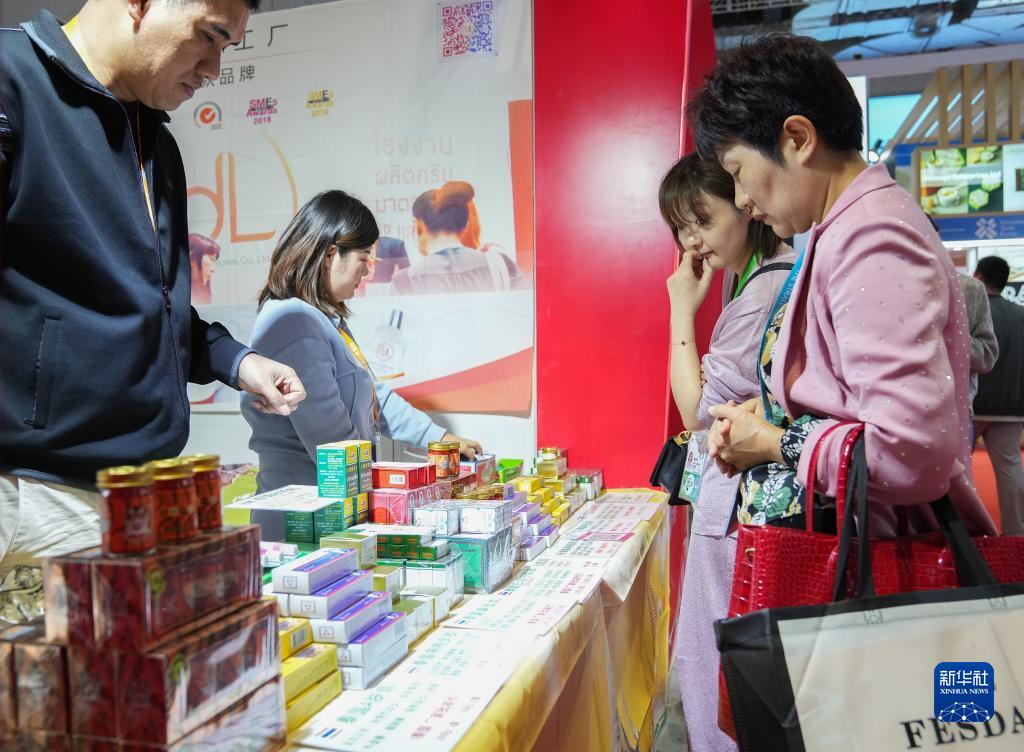 11月7日,在第六屆進博會消費品展區,泰國參觀者在諮詢來自泰國的産品信息。