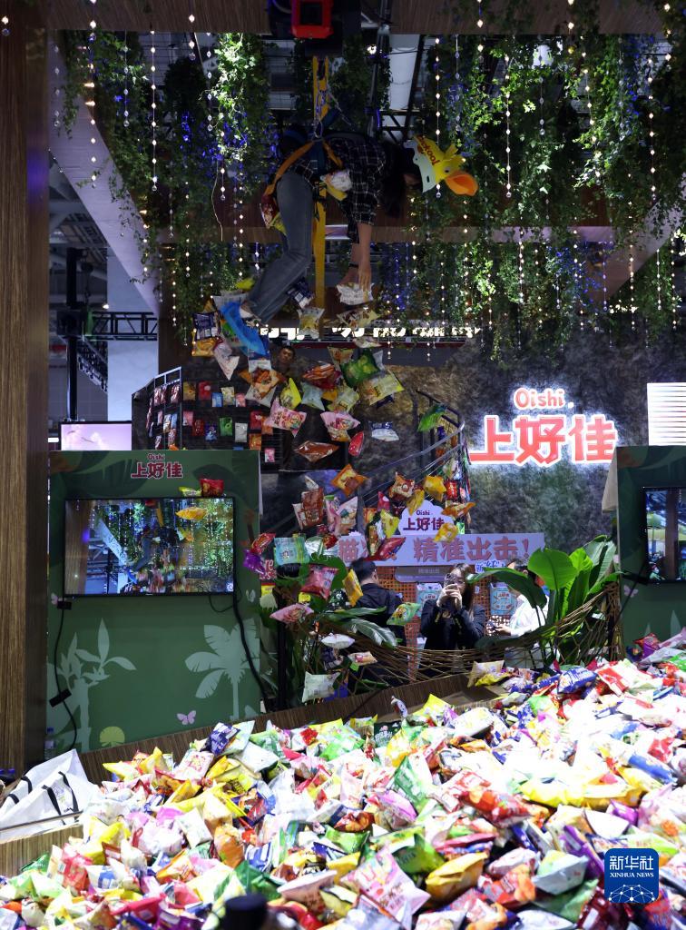 11月7日,在第六屆進博會食品及農産品展區上好佳展&,觀眾體驗互動游戲。