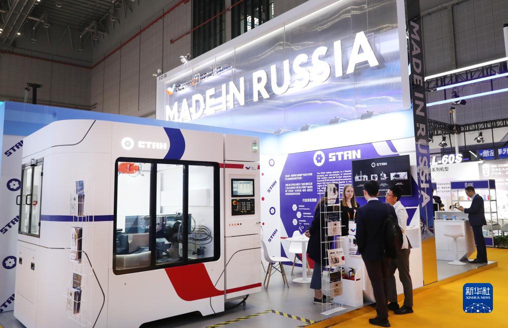 11月7日,參觀者在第六屆進博會技術裝備展區的俄羅斯企業聯合展&與展方工作人員交流。