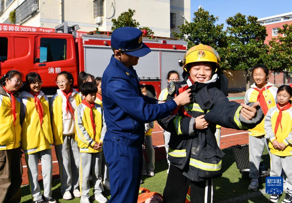 11月7日,在山東省棗莊市&兒莊區實驗小學,小學生在消防救援隊員的指導下體驗穿戴消防服裝。