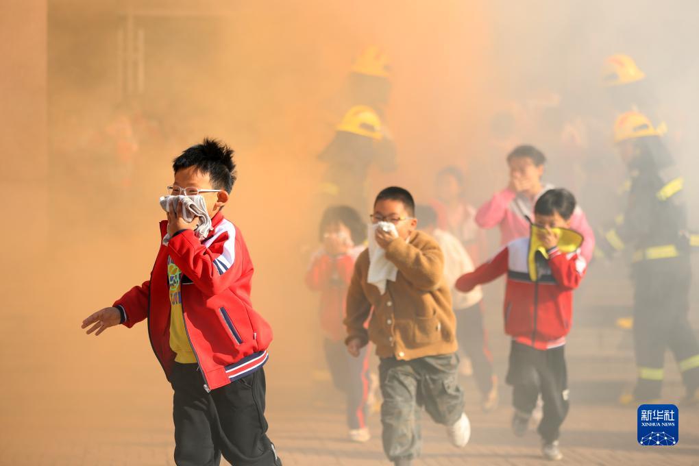 11月7日,山東省郯城縣消防救援大隊的消防救援人員在東方紅小學指導學生開展火場逃生疏散演練。