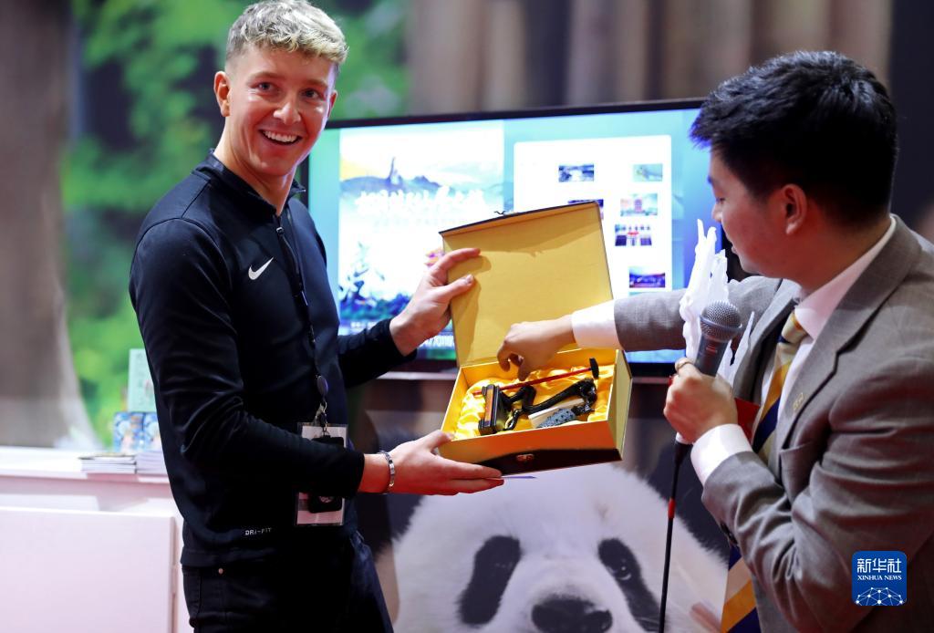 11月6日,在英國倫敦世界旅游交易會中國展區,一名男子獲得文創禮物。
