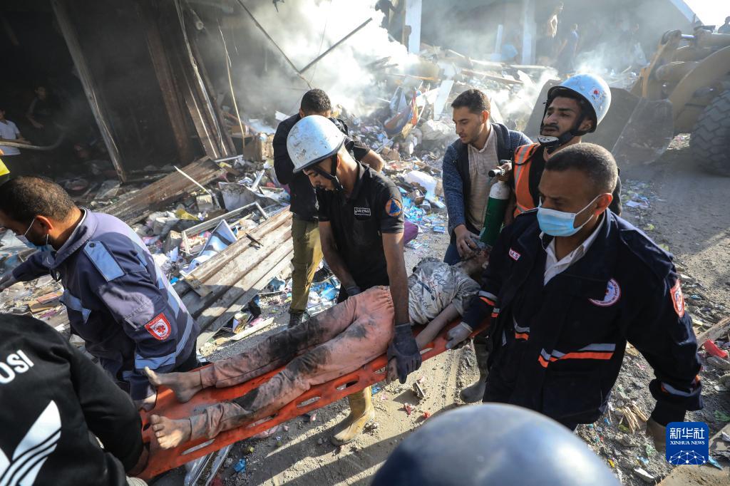 11月7日,在加沙地帶南部城市汗尤尼斯,人們在遭到以色列襲擊的建築廢墟上實施救援。