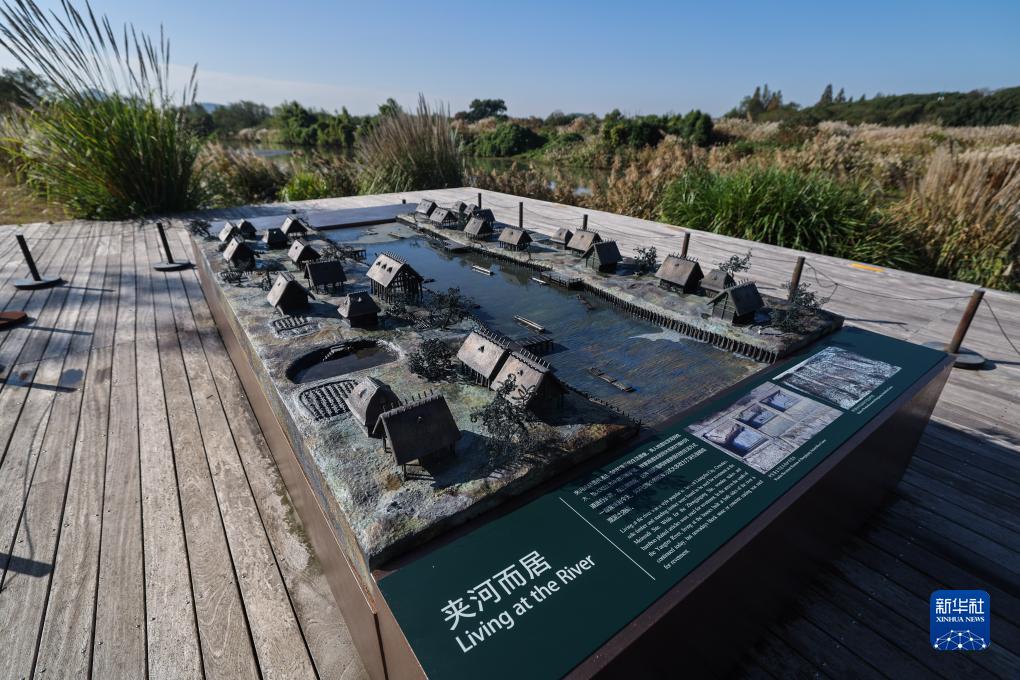 11月7日拍攝的良渚古城遺址公園鍾家港古河道旁的良渚先民夾河而居的模型展示區。