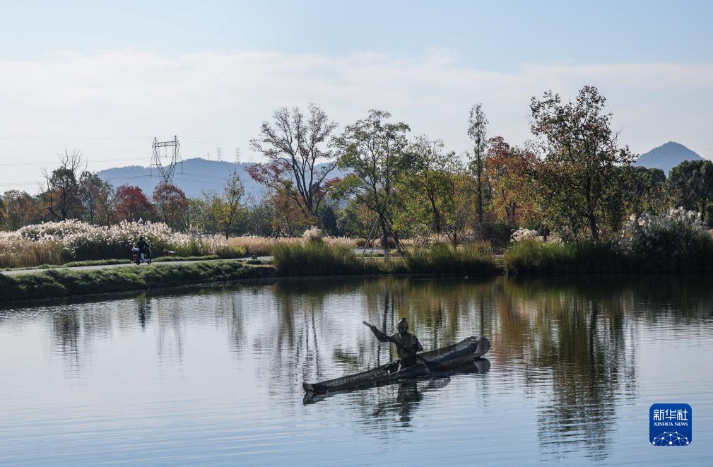 11月7日拍攝的良渚古城遺址公園內鍾家港古河道上用藝術裝置再現的良渚先民划船穿行的景觀。