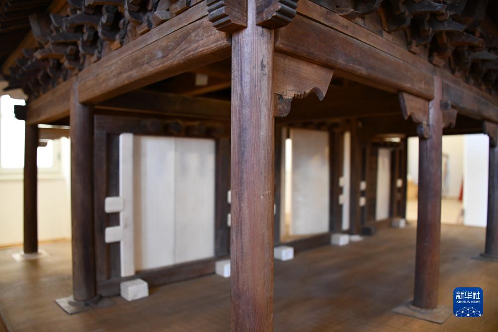 這是11月6日在斯洛文尼亞盧布爾雅那的民族志博物館拍攝的修復完成的中國古建築木質大門模型。