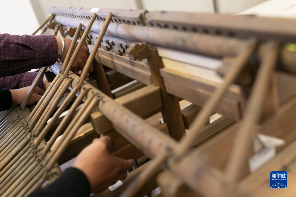 10月16日,在斯洛文尼亞盧布爾雅那的民族志博物館,故宮博物院專家修復中國古建築木質大門模型。