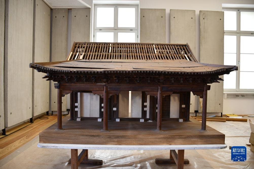 這是11月6日在斯洛文尼亞盧布爾雅那的民族志博物館拍攝的修復完成的中國古建築木質大門模型。