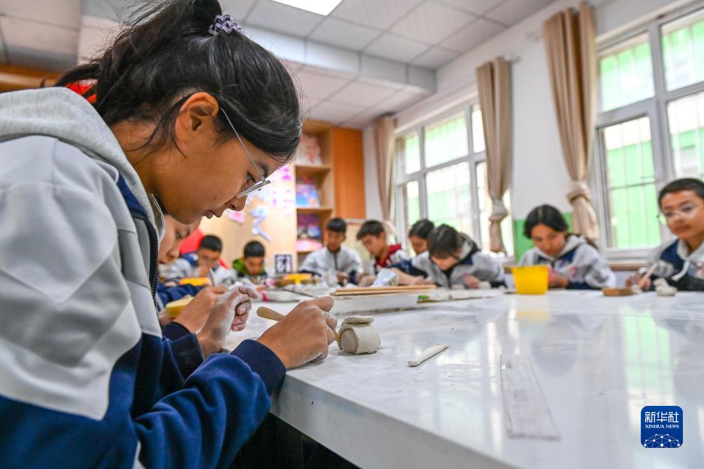 在新疆阿克陶縣雪松中學,“紅杜鵑”陶藝社團的學生在體驗陶藝製作(11月7日攝)。