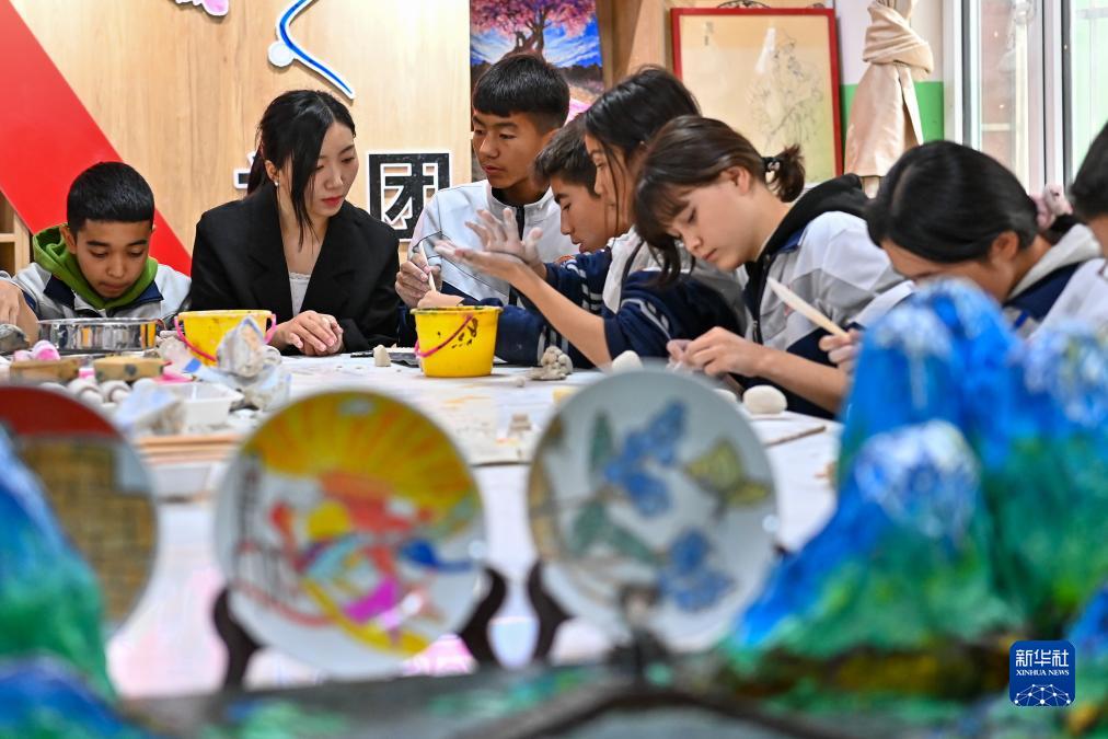 在新疆阿克陶縣雪松中學,“紅杜鵑”陶藝社團的老師在指導學生陶藝製作(11月7日攝)。
