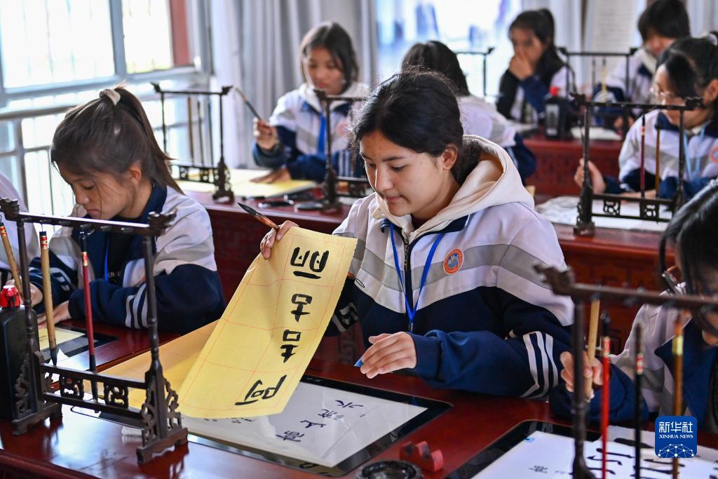 在新疆阿克陶縣雪松中學,“紅杜鵑”書法社團的學生在練習書法(11月7日攝)。