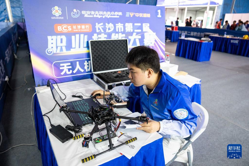 11月8日,在長沙賀龍體育中心,參賽選手在進行無人機裝調檢修項目的比拼。