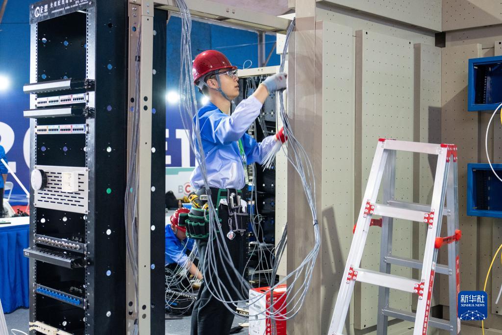 11月8日,在長沙賀龍體育中心,參賽選手在進行信息網絡佈線項目的比拼。
