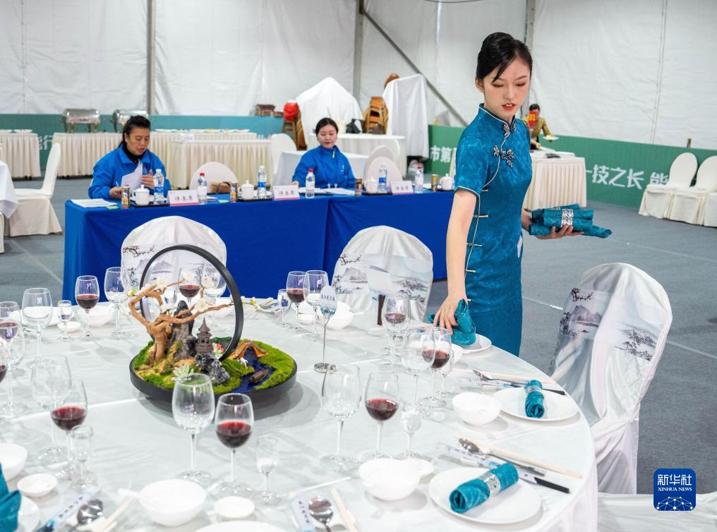 11月8日,在長沙賀龍體育中心,參賽選手(右一)在進行餐廳服務項目的比拼。