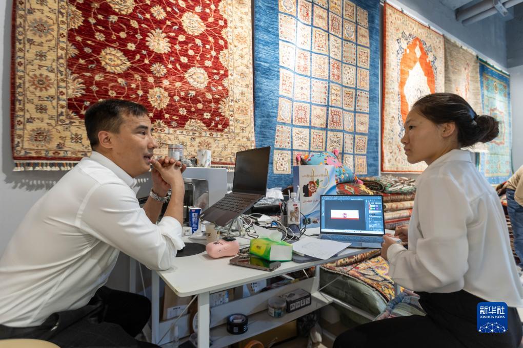 11月4日,在綠地全球商品貿易港內開設阿富汗國家進口館,阿里(左)和員工討論訂單設計。