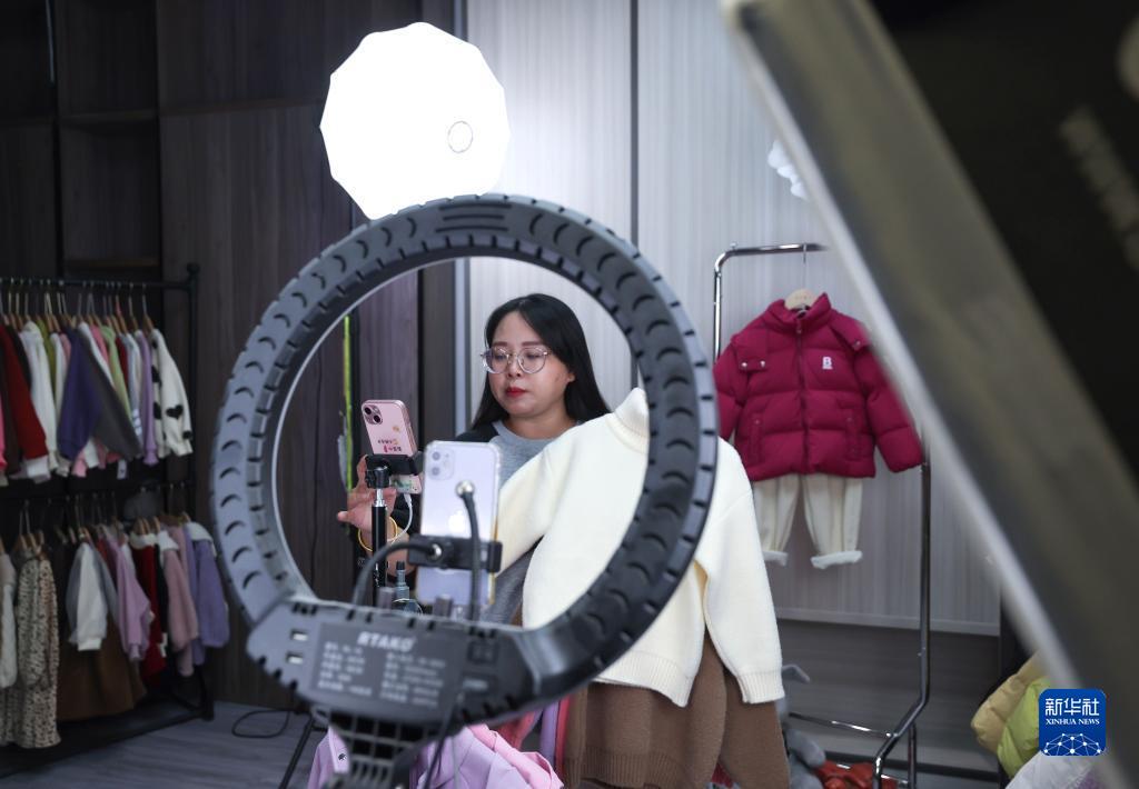 11月8日,在位於織裏鎮的湖州織裏煜果果製衣廠直播間內,工作人員進行“雙11”電商直播。