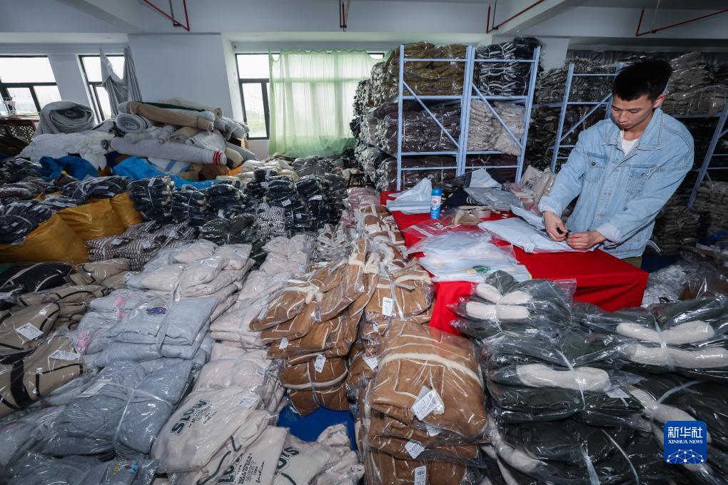 11月8日,在位於織裏鎮的湖州慕橙服飾有限公司庫房內,工作人員根據網絡訂單打包童裝。