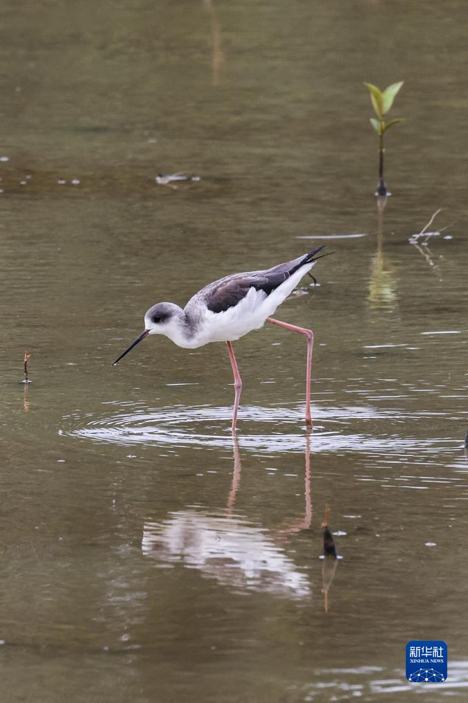 這是11月8日在海南東寨港(三江灣)生態修復項目拍攝的黑翅長腳鷸。