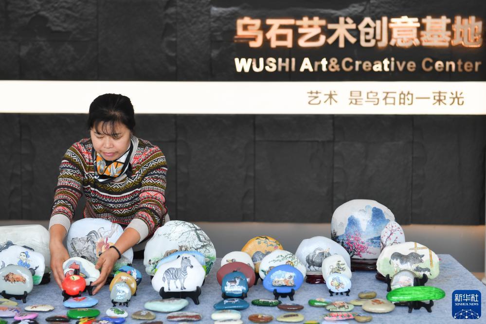11月8日,在湖南省瀏陽市小河鄉烏石村的烏石當代藝術館,農民在整理石頭畫。