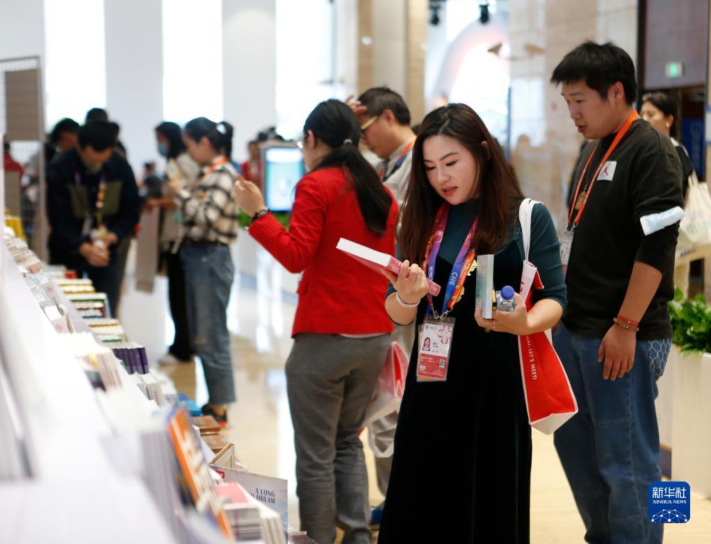 11月8日,在進博會新聞中心,記者在取閱免費贈送的書籍。