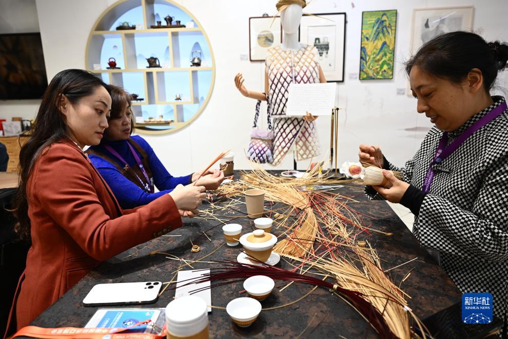 11月7日,記者在新聞中心體驗竹編。