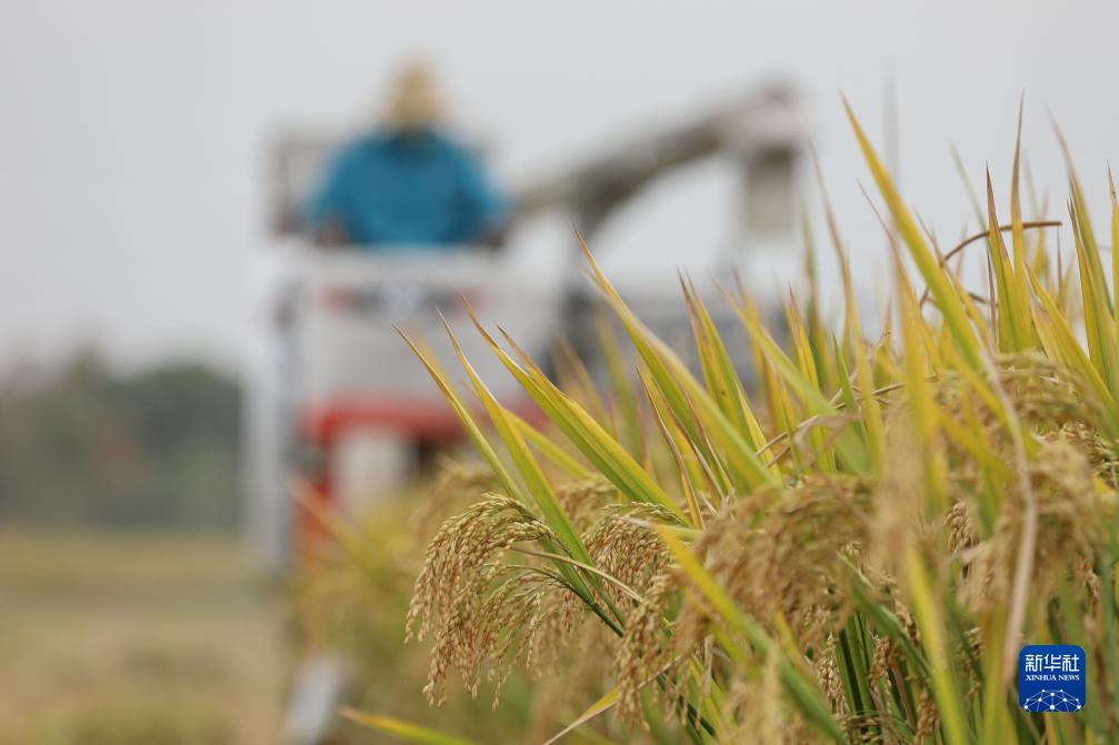 11月8日,在浙江省嘉興市南湖區余新鎮,農機手駕駛收割機在稻田間勞作。