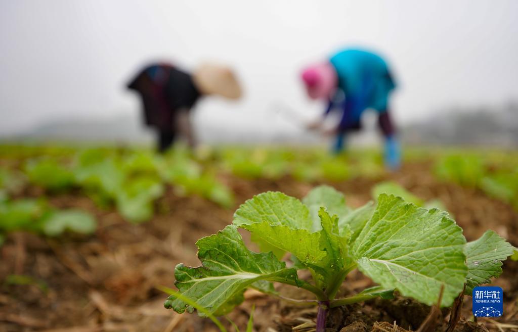 11月8日,在貴州省黔東南苗族侗族自治州丹寨縣揚武鎮長青社區,村民在田間管護青菜苗。