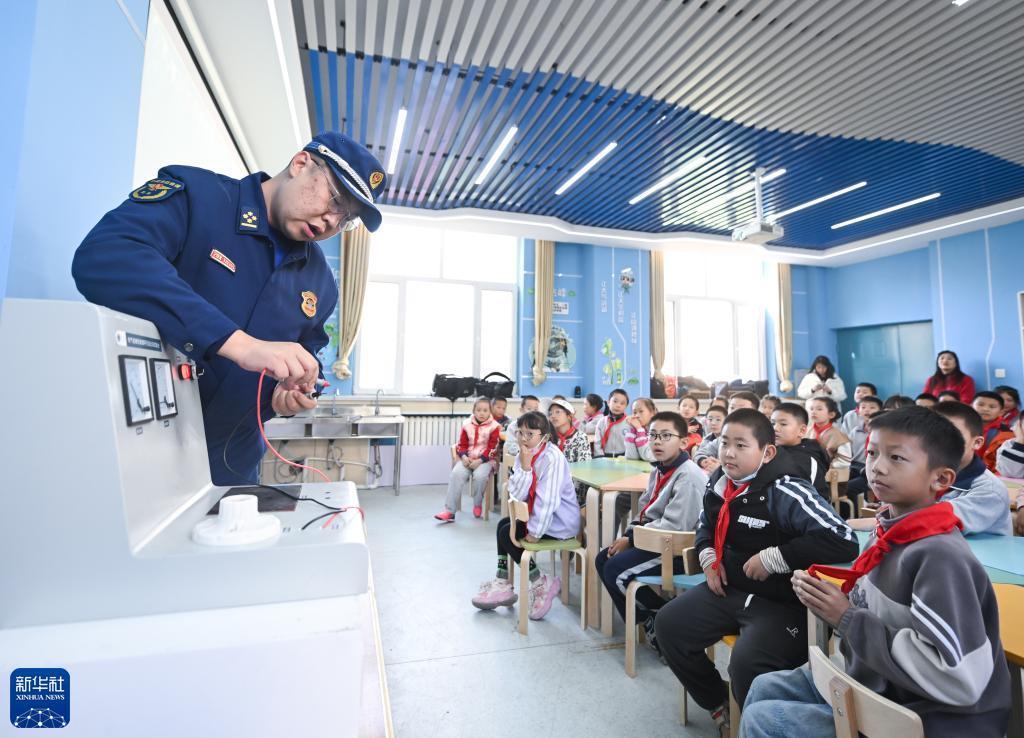 11月8日,西寧市消防救援支隊隊員在西寧市古城&小學為小朋友演示電器短路。