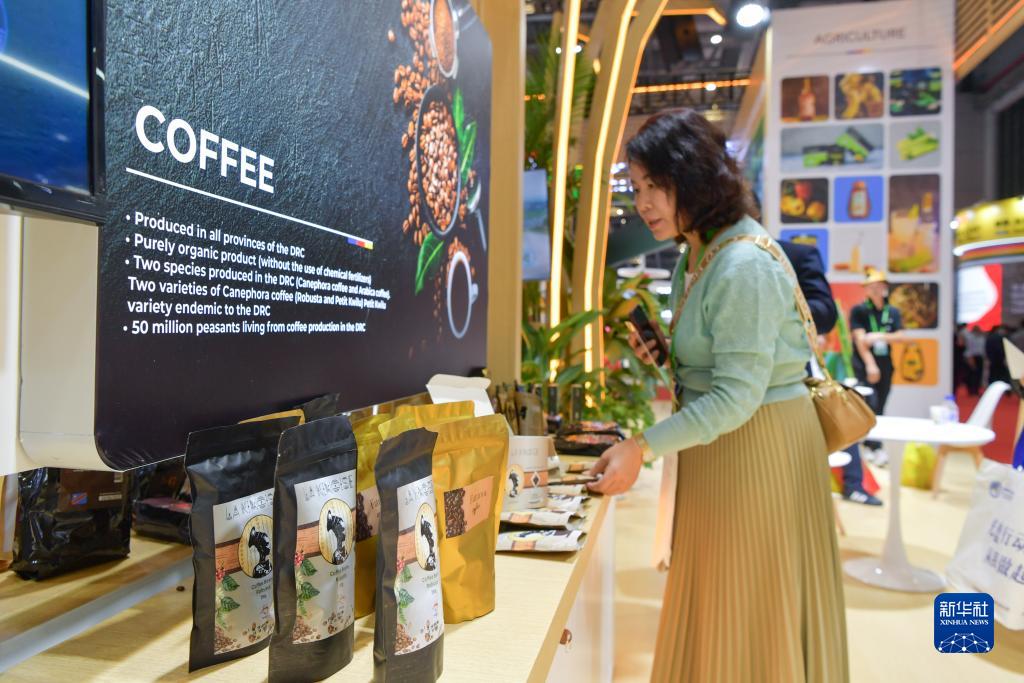 11月8日,在第六屆進博會國家展剛果民主共和國館,觀眾在了解咖啡産品。