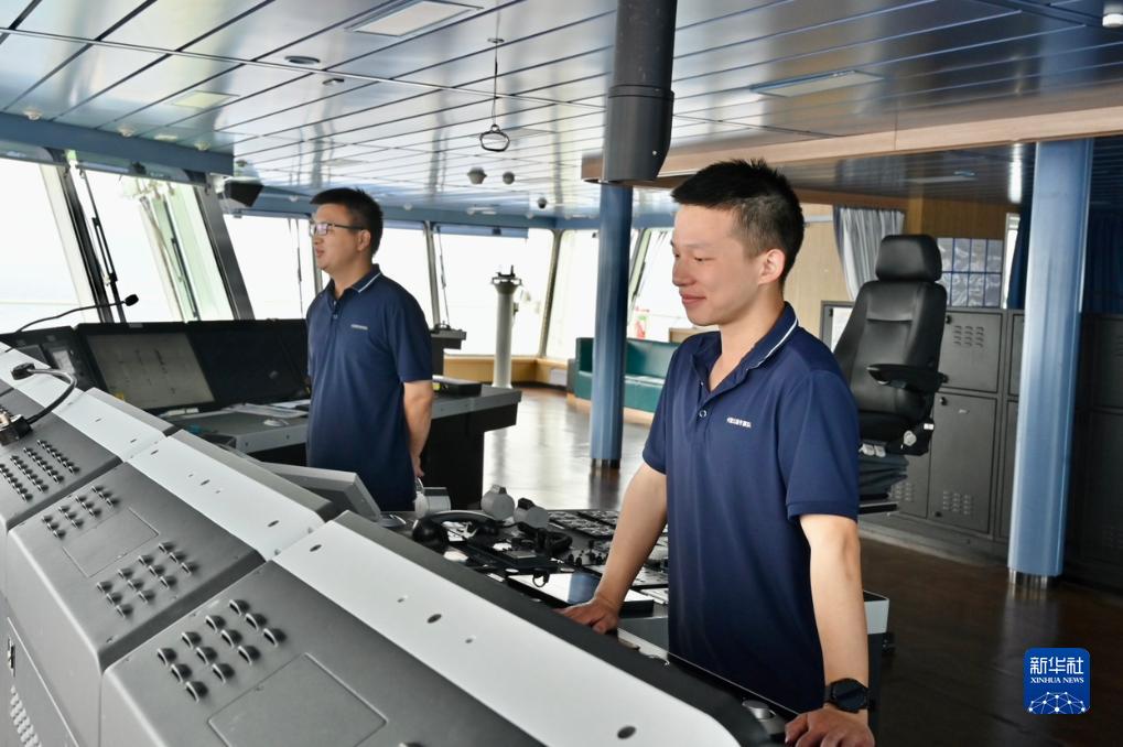 11月8日,水手杜祥磊(右)和大副陳冬林在“雪龍2”號駕駛&值班。